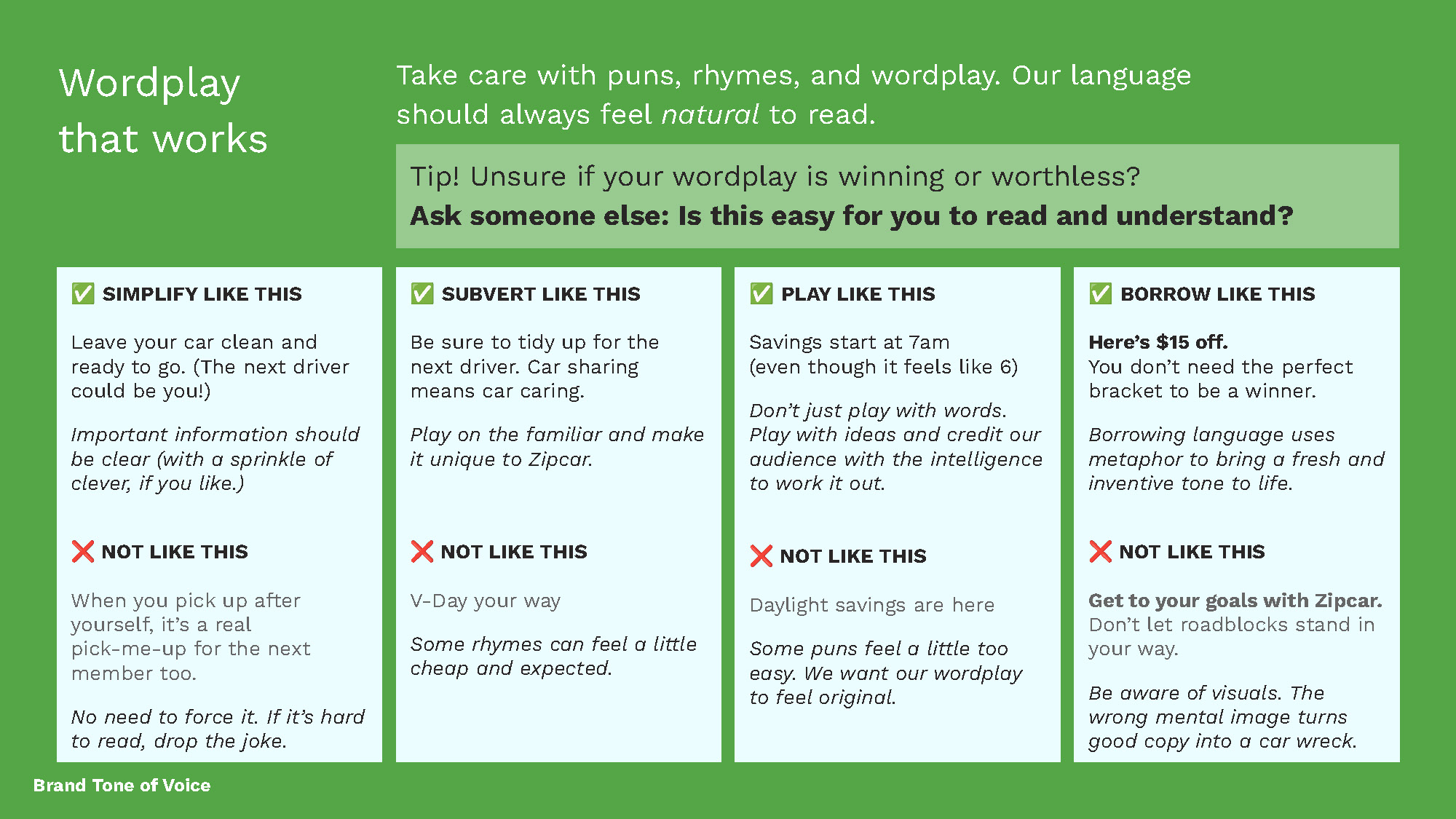 As a brand, Zipcar had grown from an “everyday outlaw” to an “innocent creator.” But they didn’t have the tools to bring it to life. Their internal copy team needed the perfect combination of creative freedom and guardrails to keep everyone on the right route.