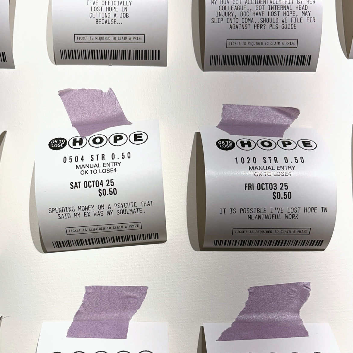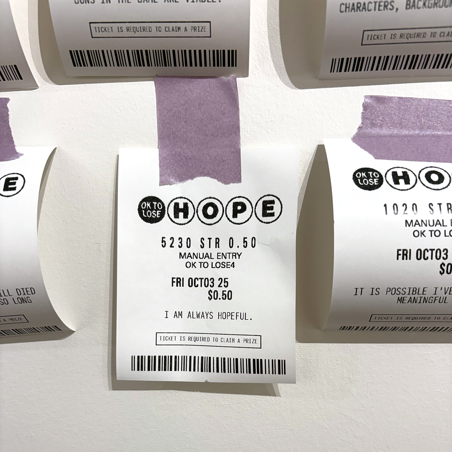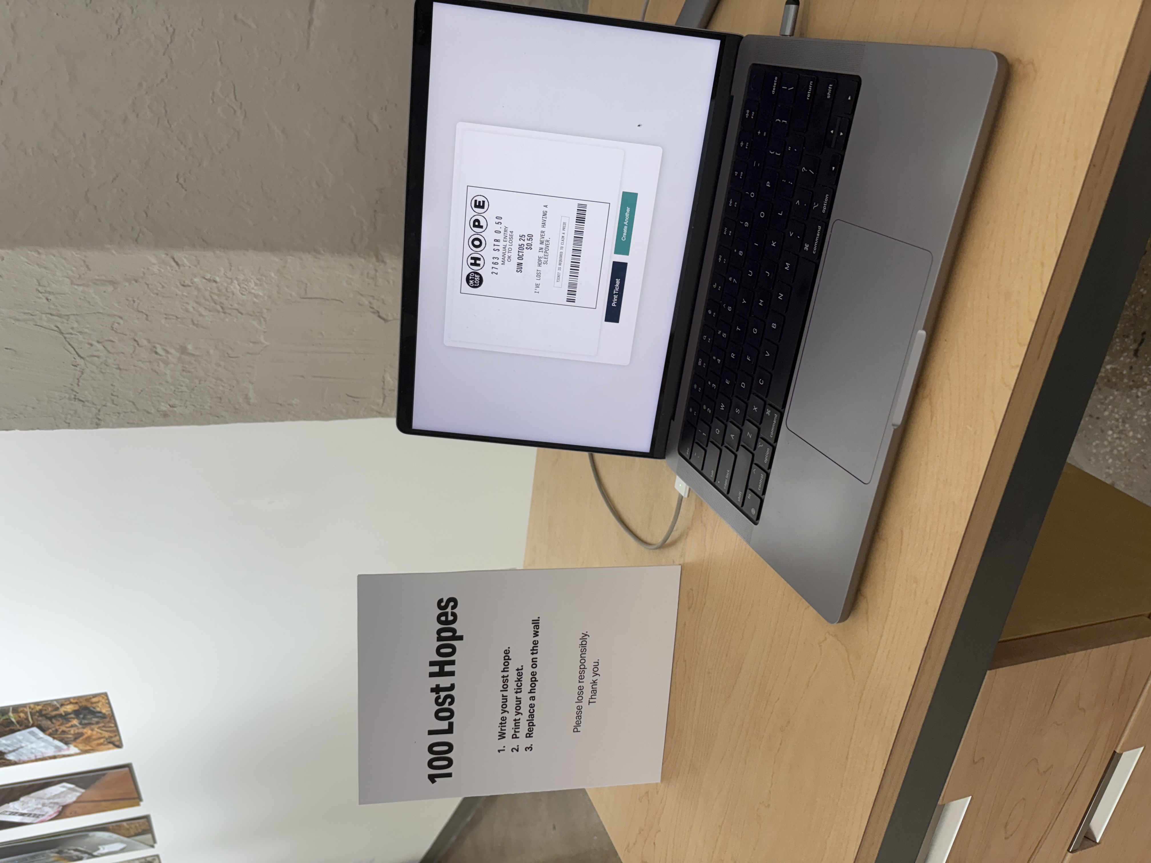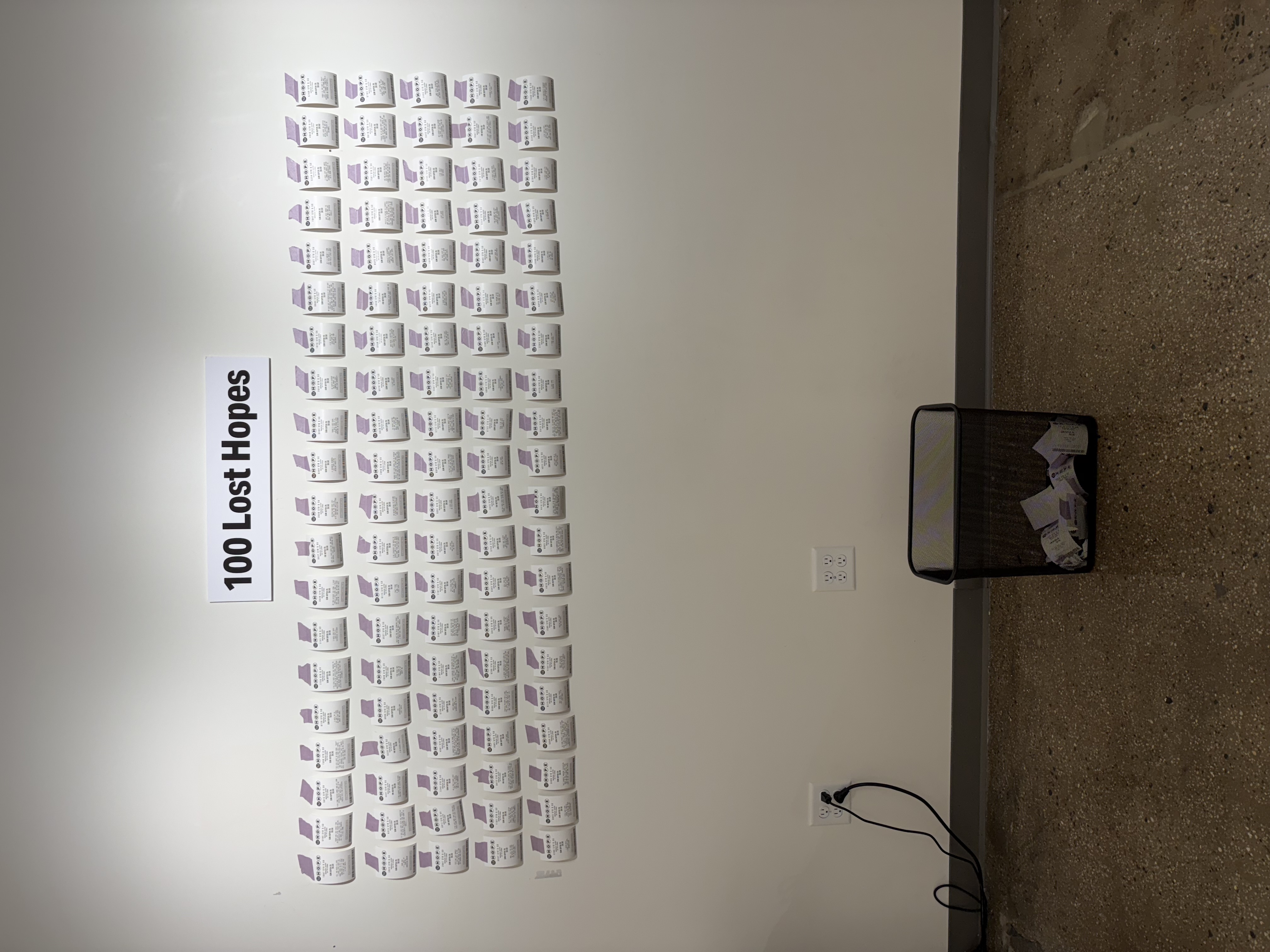 100 Lost Hopes is an interactive installation. It consists of 100 fake lottery tickets taped to a wall, each one showing a hope that someone has lost. Viewers are invited to print their own lottery ticket and replace one that's on the wall.