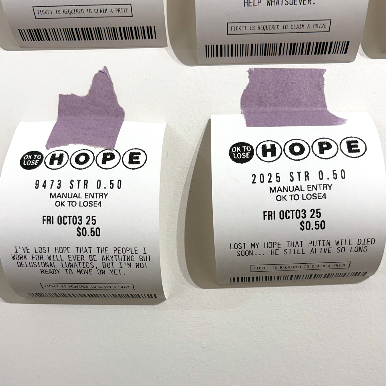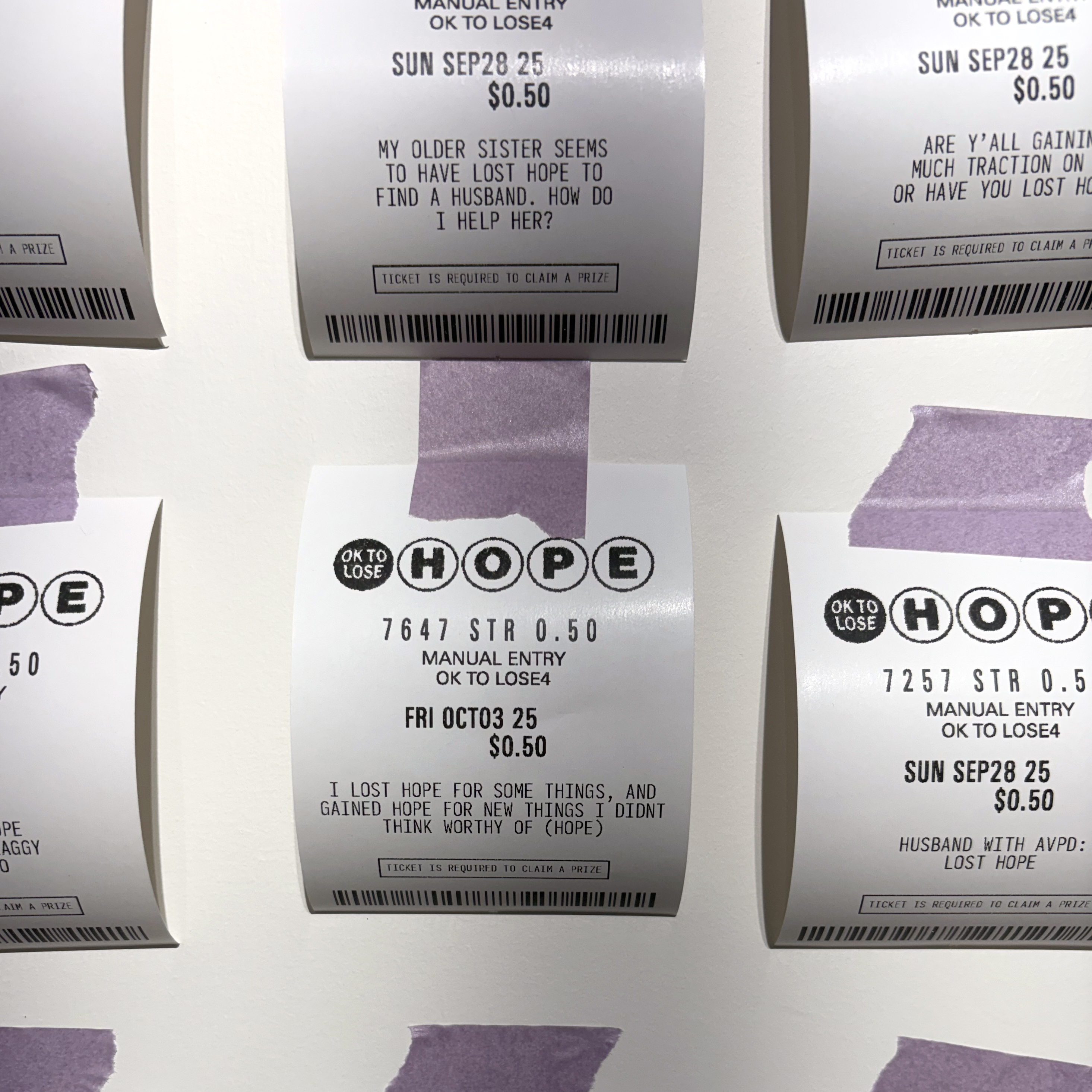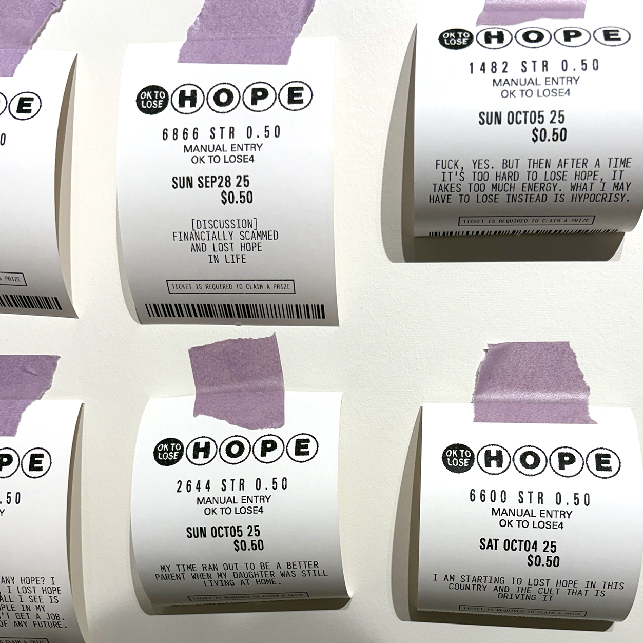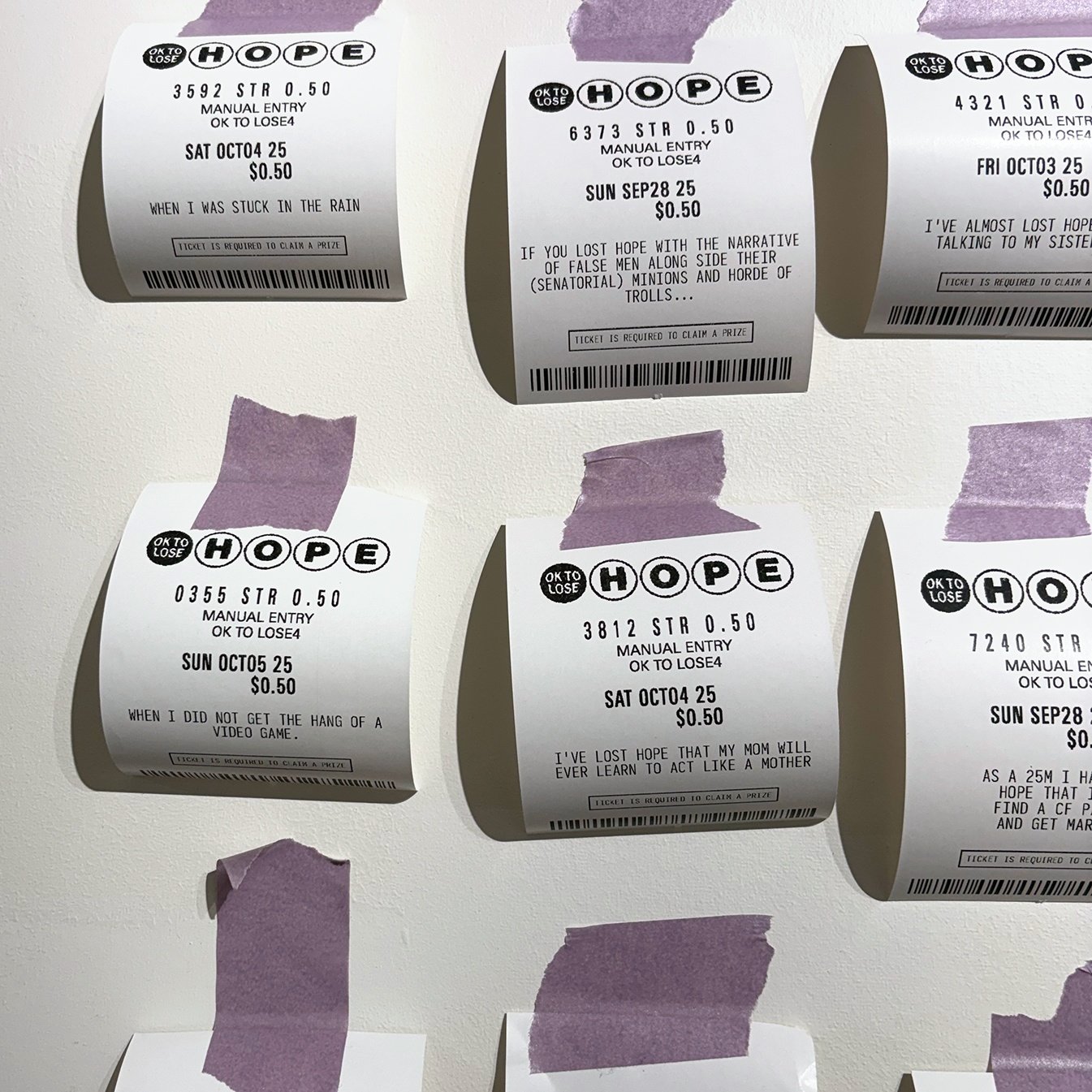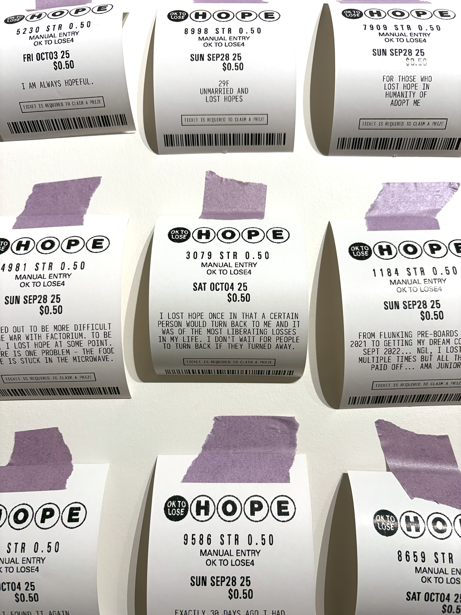 100 Lost Hopes is an interactive installation. It consists of 100 fake lottery tickets taped to a wall, each one showing a hope that someone has lost. Viewers are invited to print their own lottery ticket and replace one that's on the wall.