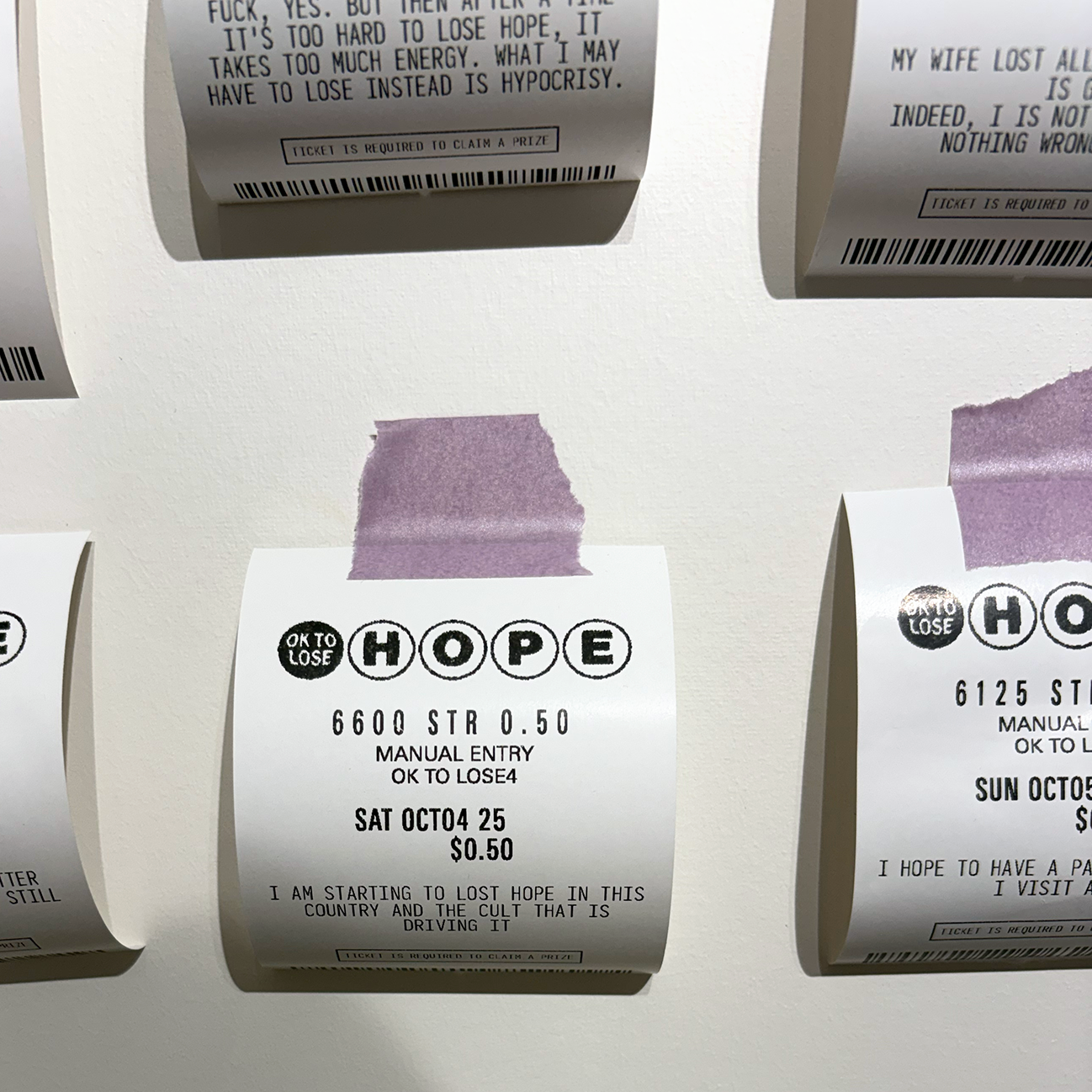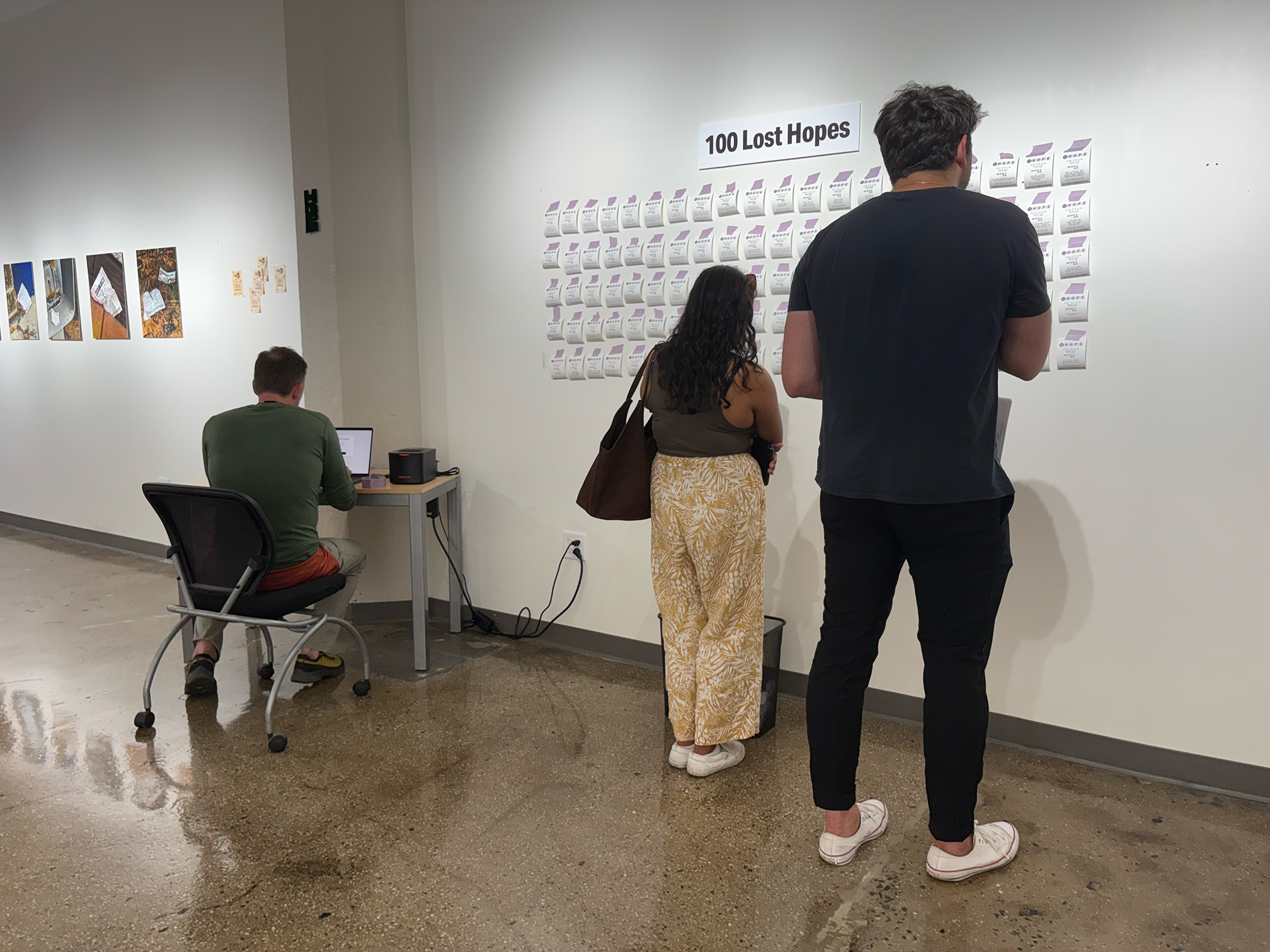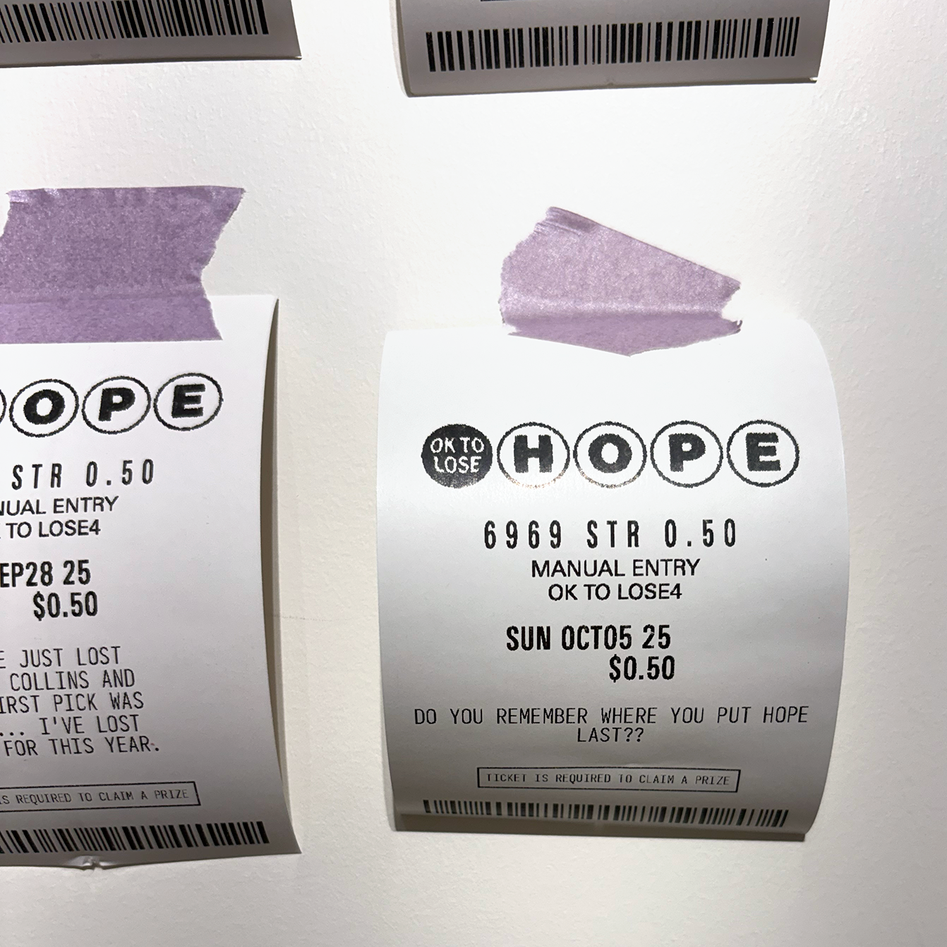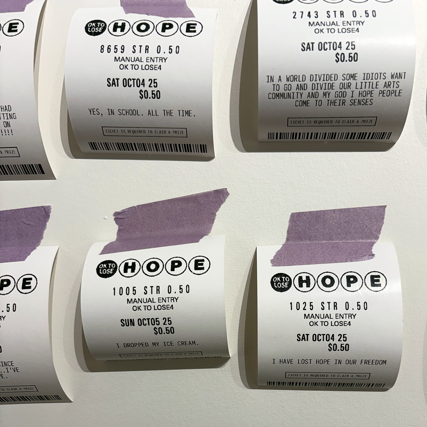 100 Lost Hopes is an interactive installation. It consists of 100 fake lottery tickets taped to a wall, each one showing a hope that someone has lost. Viewers are invited to print their own lottery ticket and replace one that's on the wall.